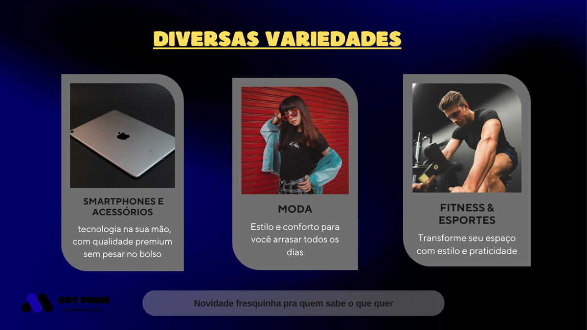 Conheça melhor nossas coleções. Aqui na Buy Prime, oferecemos produtos selecionados que unem tecnologia, qualidade e confiança.